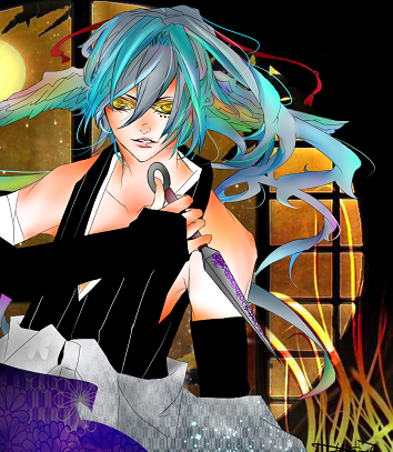 Hair: 灰色に、青色の房が混じる。長髪。ぽにて。